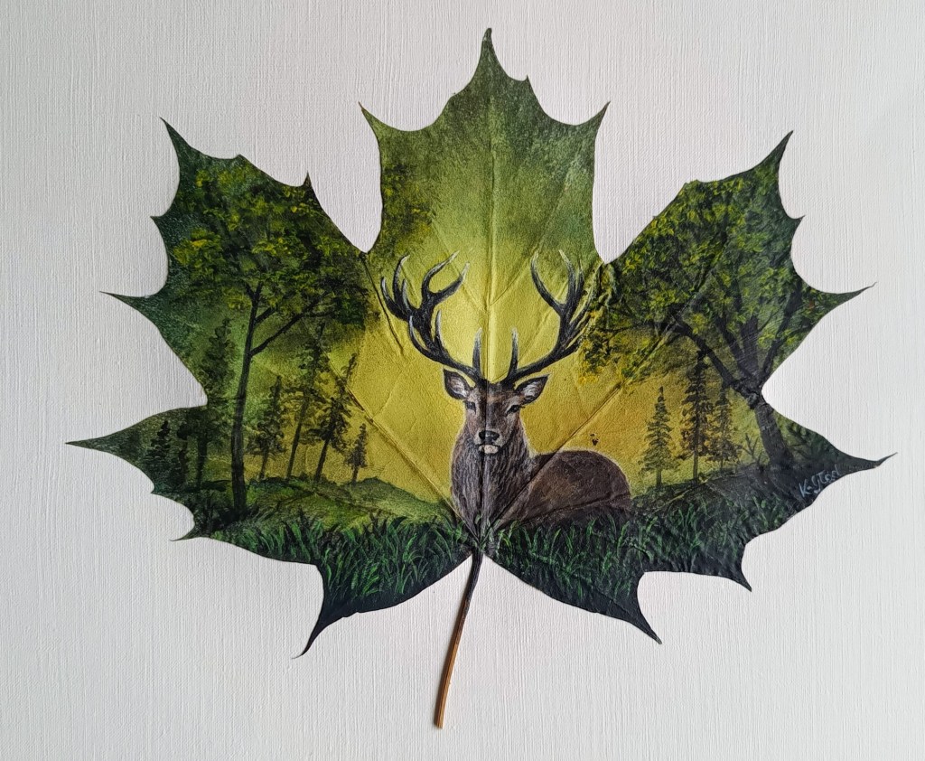 I primarily work with acrylic and oil paints on various surfaces such as canvas, paper, and wooden panels. However, my signature medium is something more unconventional – I also paint on real, dried maple leaves, transforming them into unique, organic pieces of art.